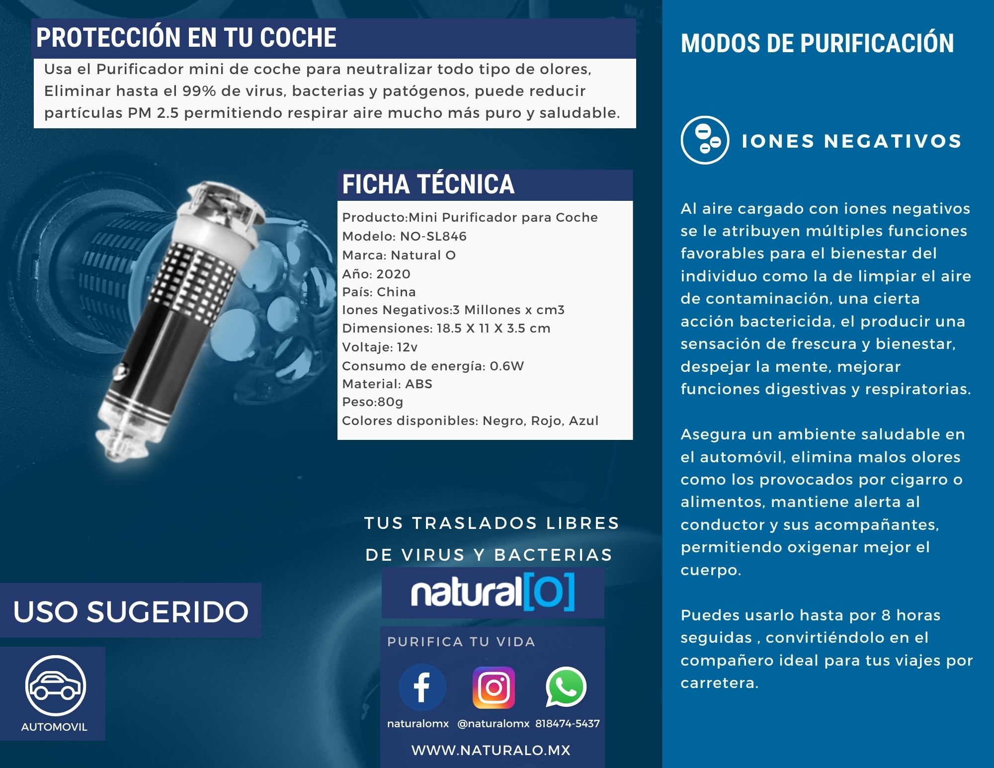Este Mini Purificador de aire produce iones negativos que ayudan a mejorar la calidad del aire al destruir partículas dañinas que se encuentran en el medio ambiente.